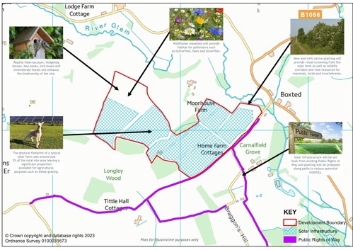 The plan to the right shows the preliminary layout for Boxted Solar Farm which will be capable of producing 20MW of clean and renewable electricity. The preliminary layout is based on initial findings from environmental and technical surveys which are ongoing. We are currently consulting on this layout and as such, it is subject to change. In addition to the solar panels, the site infrastructure is expected to include: